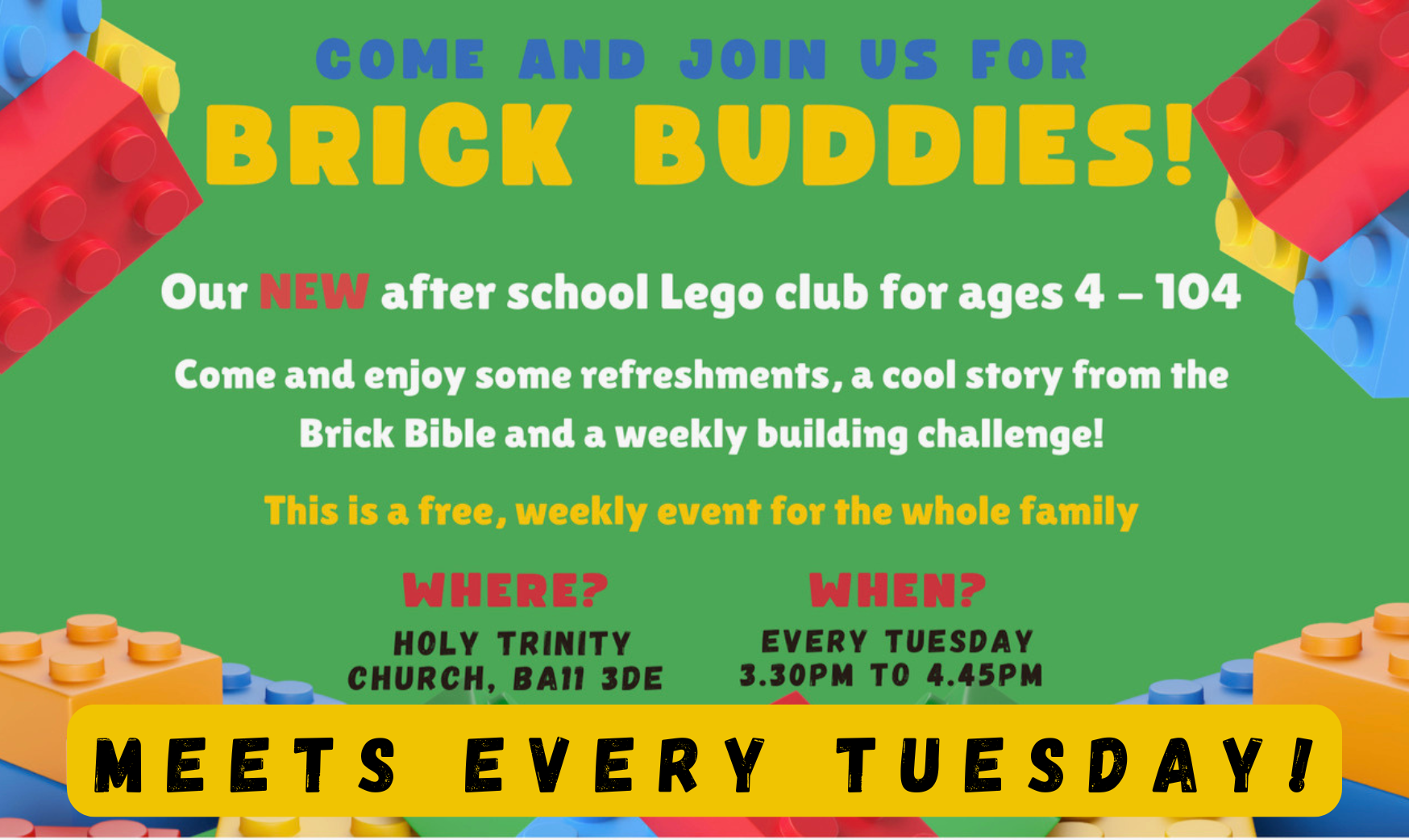 We also run an after school Lego club that meets every Tuesday from 3.30-4.45pm, but it’s not just for kids. All are welcome.